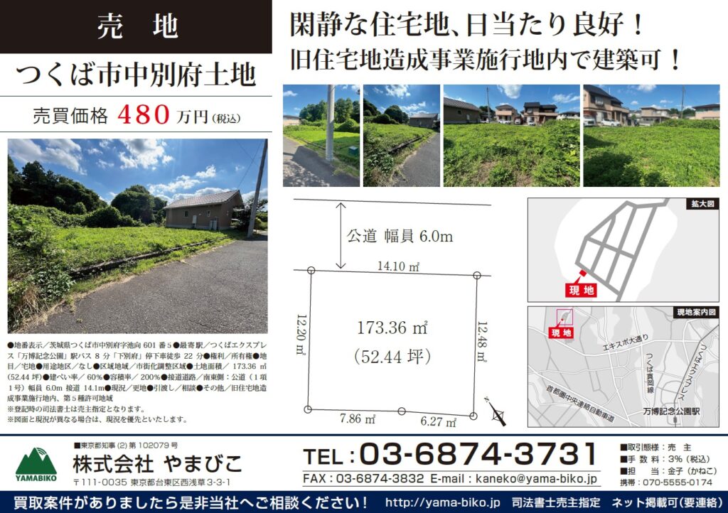 つくは市中別府土地480万円売却契約済
