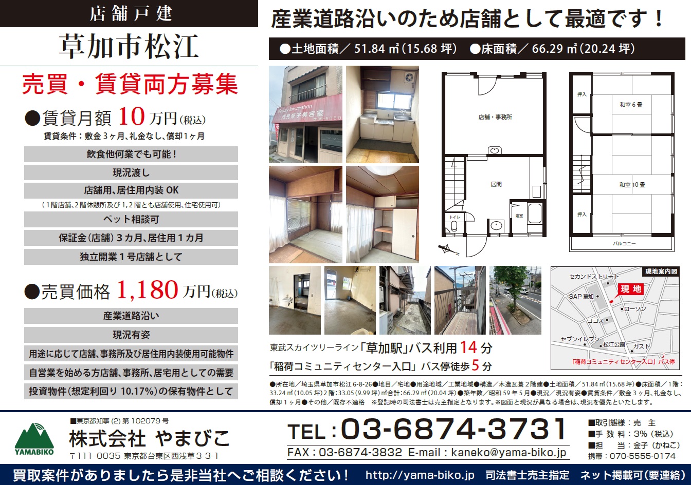 草加松江店舗戸建 賃貸・売買契約済み やまびこNEWS 2024.10.15 草加松江店舗戸建 月10万円にて餃子屋賃貸契約済 賃貸付いてからオーナーチェンジ物件として1100万! 確定利回り10.91%で売却契約済 担当 カイ課長
